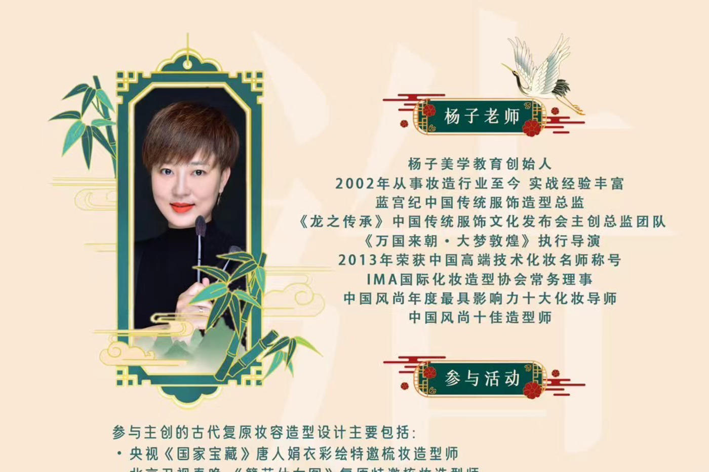 ·央视《国家宝藏》唐人娟衣彩绘特邀梳妆造型师·北京卫视春晚《簪花仕女图》复原特邀梳妆造型师·央视《星光大道》栏目唐代复原特邀梳妆造型师