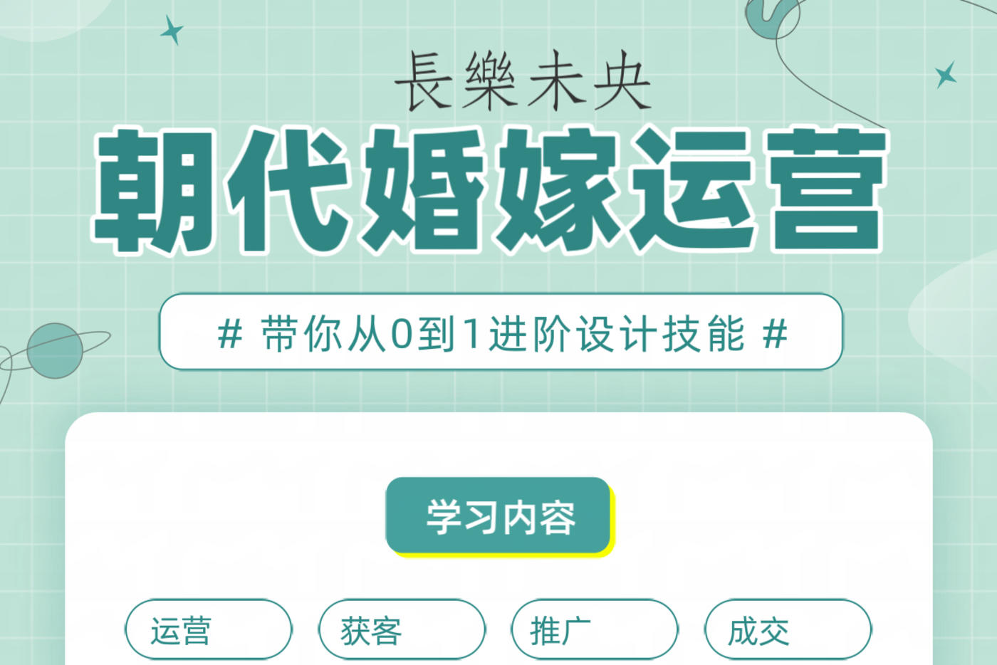 長樂未央 朝代婚嫁运营 # 带你从0到1进阶设计技能 # 学习内容 运营 获客 推广 成交 行业经验分享 市场趋势解析 创意展示 互动讨论 资源对接 专业团队技能过硬 百万案例课程体系 丰富适会不同进度 陪伴式分享一对一答疑解惑 ¥3850地点苏州: 胥口长乐未央艺术展厅 代理商课程免费♥️[更多…]