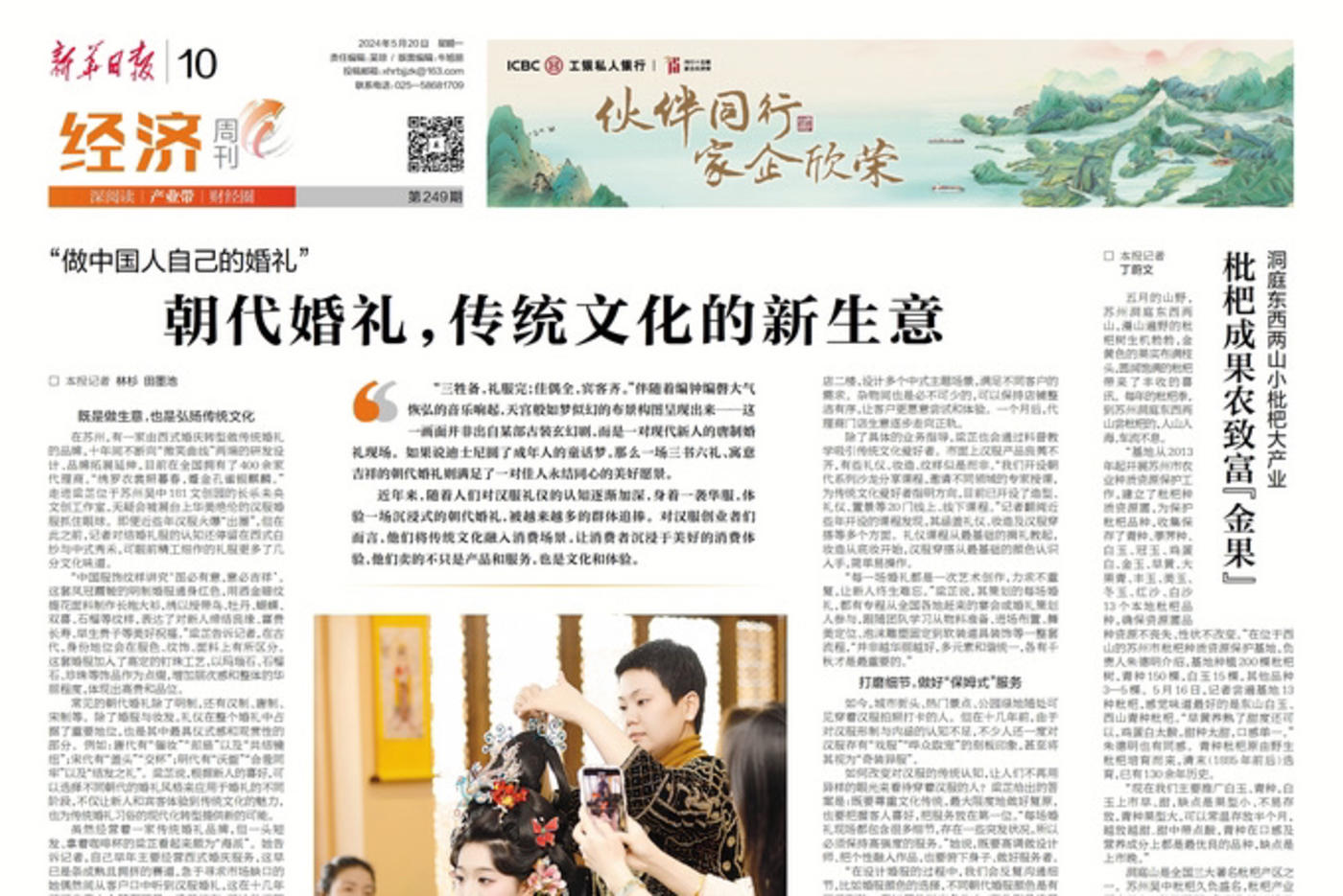 □ 本报记者 林杉 田墨池 朝代婚礼,传统文化的新生意 新华日报2024-05-20 “三牲备,礼服完;佳偶全,宾客齐。”伴随着编钟编磬大气恢弘的音乐响起,天宫般如梦似幻的布景构图呈现出来——这一画面并非出自某部古装玄幻剧,而是一对现代新人的唐制婚礼现场。如果说迪士尼圆了成年人的童话梦,那么一场三书六礼、寓意吉祥的朝代婚礼则满足了一对佳人永结同心的美好愿景。 近年来,随着人们对汉服礼仪的认知逐渐加深,身着一袭华服,体验一场沉浸式的朝代婚礼,被越来越多的群体追捧。对汉服创业者们而言,他们将传统文化融入消费场景,让消费者沉浸于美好的消费体验,他们卖的不只是产品和服务,也是文化和体验。 既是做生意,也是弘扬传统文化 在苏州,有一家由西式婚庆转型做传统婚礼的品牌,十年间不断向“微笑曲线”两端的研发设计、品牌拓展延伸,目前在全国拥有了400余家代理商。“绣罗衣裳照暮春,蹙金孔雀银麒麟。”走进梁芷位于苏州吴中181文创园的长乐未央文创工作室,无疑会被展台上华美绝伦的汉服婚服抓住眼球。即便近些年汉服火爆“出圈”,但在此之前,记者对结婚礼服的认知还停留在西式白纱与中式秀禾,可眼前精工细作的礼服更多了几分文化味道。 “中国服饰纹样讲究‘图必有意,意必吉祥’。这套凤冠霞帔的明制婚服通身红色,用洒金暗纹提花面料制作长拖大衫,绣以绶带鸟、牡丹、蝴蝶、双喜、石榴等纹样,表达了对新人缔结良缘、富贵长寿、早生贵子等美好祝福。”梁芷告诉记者,在古代,身份地位会在服色、纹饰、面料上有所区分。这套婚服加入了高定的钉珠工艺,以玛瑙石、石榴石、珍珠等饰品作为点缀,增加层次感和整体的华丽程度,体现出高贵和品位。 常见的朝代婚礼除了明制,还有汉制、唐制、宋制等。除了婚服与妆发,礼仪在整个婚礼中占据了重要地位,也是其中最具仪式感和观赏性的部分。例如:唐代有“催妆”“却扇”以及“共结镜纽”;宋代有“盖头”“交杯”;明代有“沃盥”“合卺同牢”以及“结发之礼”。梁芷说,根据新人的喜好,可以选择不同朝代的婚礼风格来应用于婚礼的不同阶段,不仅让新人和宾客体验到传统文化的魅力,也为传统婚礼习俗的现代化转型提供新的可能。 虽然经营着一家传统婚礼品牌,但一头短发、拿着咖啡杯的梁芷看起来颇为“海派”。她告诉记者,自己早年主要经营西式婚庆服务,这早已是条成熟且拥挤的赛道,急于寻求市场缺口的她偶然间从客户口中听到汉服婚礼,这在十几年前还非常小众甚至罕见。梁芷坦言,开始做汉服婚礼是为了生存,可那次对接客户的经历也让她产生惊诧,“原来,中国人自己的婚礼这么美。” 从此,梁芷开启了传统婚礼的“二次创业”,于2015年成立长乐未央文创工作室。没有多少现成的经验和模式可循,市面上能买来制作汉服的原料也很少,她迎难而上,从典籍、古画中摸索和学习。转折点在2018年,那年她以敦煌壁画《婚嫁图》为灵感来源,对婚礼妆容、发型、服饰等作了复原,后来受到央视邀请参与了《登场了敦煌》《霓裳时光秀》等节目的录制。2019年,为了寻找更齐全的婚服布料,以及专业的裁缝师傅,她带领工作室从宁波转战苏州。 “做朝代婚礼10年了,我们没有做过重复案例。无论是给客户做的婚服、妆造,还是婚礼置景、舞台表演,我没有落下过任何一场,全都亲力亲为,这些作品也没法量产。”随着客户好评越来越多,梁芷收获了更多的感动与信心,未来她希望将品牌打造成行业前瞻者,做中国特色的婚嫁产业。“任何一个行业都有波峰波谷,但我觉得国潮文化会一直延续下去。从创业到现在,我对自己的定位都是‘商人中的艺术家’。”梁芷说。 曾经是客户,如今变合作伙伴 “一个满意的客户可以给你带来新的潜在客户。”梁芷通过10年多的用心“浇灌”,让汉服爱好者、传统文化爱好者、婚礼策划人都成为自己的“圈体”客户。“目前我们在全国发展了400多家代理商,其中约有六成都来自‘圈体’客户。”在梁芷看来,维护好“圈体”客户除了挣口碑,也是品牌扩大市场影响力的关键。 梁芷还清晰记得去年3月31日上午,一通来自代理店掌柜的“求救”电话。作为刚跨行的生意小白,她的汉服店装修完成后成效不尽如人意。梁芷与她简单沟通后,立即买了车票,前去“救火”。 门头太普通、拍摄点太少、照明灯光颜色太白……一进门,梁芷便找出来了一堆问题。店面门头是引流的关键之一,直接传递品牌的形象和理念,太普通无法吸引客人驻足观看。同时,体验馆仅有一个拍摄点限制了作品的多样性,无法吸引线上客户。纯白色的照明灯光也难以凸显出汉服的光彩。 梁芷一边绘制图稿一边建议将门厅打斜后搭建,并设置玻璃展示墙、安装可调节的滑轨射灯,如今其中陈设的精美凤冠成了新型打卡点。在门店二楼,设计多个中式主题场景,满足不同客户的需求。杂物间也是必不可少的,可以保持店铺整洁有序,让客户更愿意尝试和体验。一个月后,代理商门店生意逐步走向正轨。 除了具体的业务指导,梁芷也会通过科普教学吸引传统文化爱好者。市面上汉服产品良莠不齐,有些礼仪、妆造、纹样似是而非。“我们开设朝代系列沙龙分享课程,邀请不同领域的专家授课,为传统文化爱好者指明方向,目前已开设了造型、礼仪、置景等20门线上、