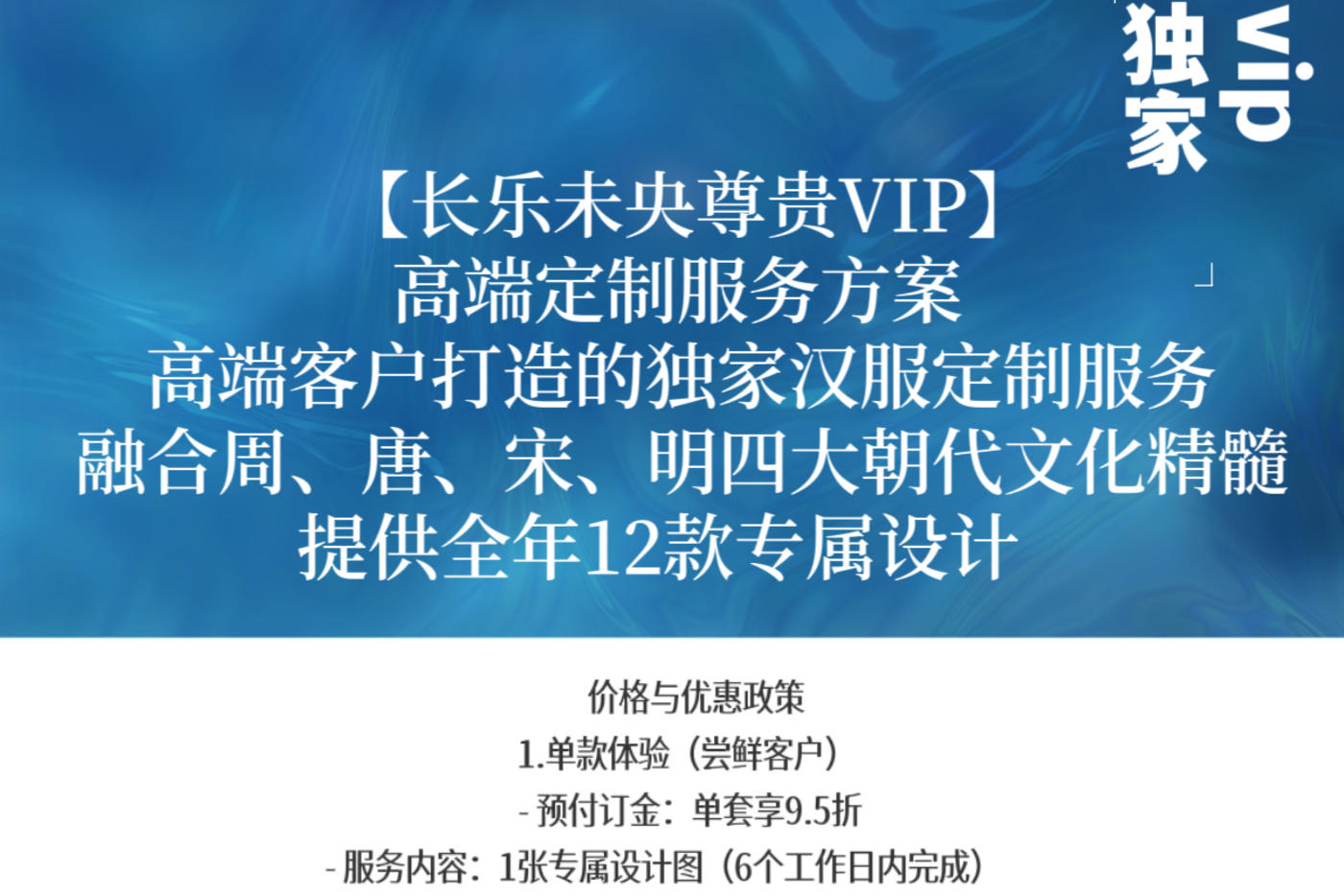 长乐未央尊贵VIP】高端定制服务方案 专为高端客户打造的独家汉服定制服务 融合周、唐、宋、明四大朝代文化精髓 提供全年12款专属设计 价格与优惠政策 1.单款体验(尝鲜客户) - 预付订金:单套享9.5折 - 服务内容:1张专属设计图(6个工作日内完成) + 单套服装制作【40个工作日】 2. 全年尊享(VIP客户) - 全年预付:(6.5折) - 服务内容:12张设计图(40个工作日内完成) + 全年12套服装,单款低至¥3000元 初级款5800 【出阁敬酒拍摄】 中级款8800 【出阁敬酒仪式】 高配款12800 【仪式大拖尾】 顶级款19800 【仪式款独家区域保护】 长乐未央至尊款25800 【原创款独一件 大全套 扇子 盖头 鞋子 婚服 专属头饰】 ✅ 文化传承:每款设计均以历史形制为基底,结合现代审美 ✅ 尊享服务:一对一设计定制,确保稀缺性与独特性 ✅ 准时交付:每月15-20日稳定发货,承诺零延误 差异化优势* - 独家性:每款仅限VIP客户拥有,避免撞款。 - 灵活性:支持个性化调整(面料、纹样、配饰)。 - 文化附加值:每套服装附带历史背景解读,增强收藏意义 文旅博物馆复原系列:22800起 【参考出图汉服形制】艺术再现[更多…]