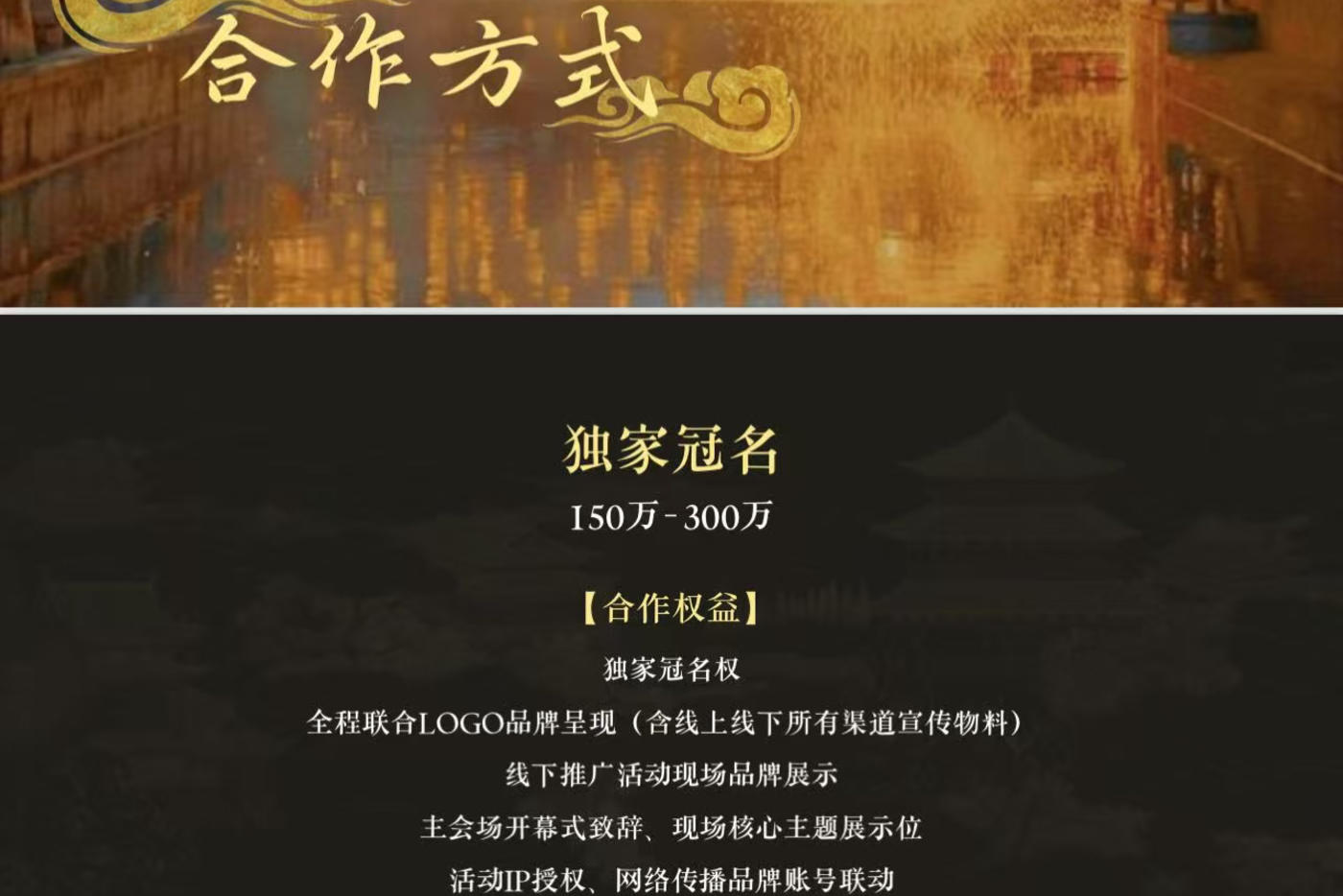 2025新品[更多…]品鉴推荐 食品健康类 健康养生/保健品/茶/酒/饮料等 新青年国风养生,崇尚东方美,重视传统礼仪文化,与活动内涵完美结合。 品牌曝光 舞台植入 联名伴手礼 线下互动巡展 美业服饰类 医美/美妆/个护/服饰等 悦己经济当道,自信美丽新女性的消费升级,高颜值让“她”怦然心动。 品牌曝光 舞台植入 联名限定款 线下互动巡展 产业啊政宣类 政府主管单位、相关产业/行业组织等 集聚产业优秀代表共襄盛举,推进地域文旅经济增长 新闻报道 文化沙龙 政府宣讲 现场展演 生活方式类 汽车/数码/餐饮/文创礼品/体验项目等 诗与远方在眼前,实力种草品质生活。 品牌曝光 舞台植入 活动指定用品 现场展演 合作方式 独家冠名 150万-300万 合作权益 独家冠名权 全程联合Logo品牌呈现(含线上线下所有渠道宣传物料) 线下推广活动现场品牌展示 主会场开幕式致辞、现场核心主题展示位 活动Ip授权、网络宣传品牌帐号联动 超A级全煤体品牌资源包 战略合作 50万-100万 合作权益 战略合作标识 各渠道宣传物料品牌Logo专属展位 现场优选展位 年度活动Ip授权 网络传播品牌帐号联动 A级全煤体品牌广告资源包 联合特约 20万-30万 合作权益 各渠道宣传物料品牌专属展位 现场优选展位 或定期间Ip授权网络传播品牌帐号联动 优选全煤体品牌广告资源包 [更多…]