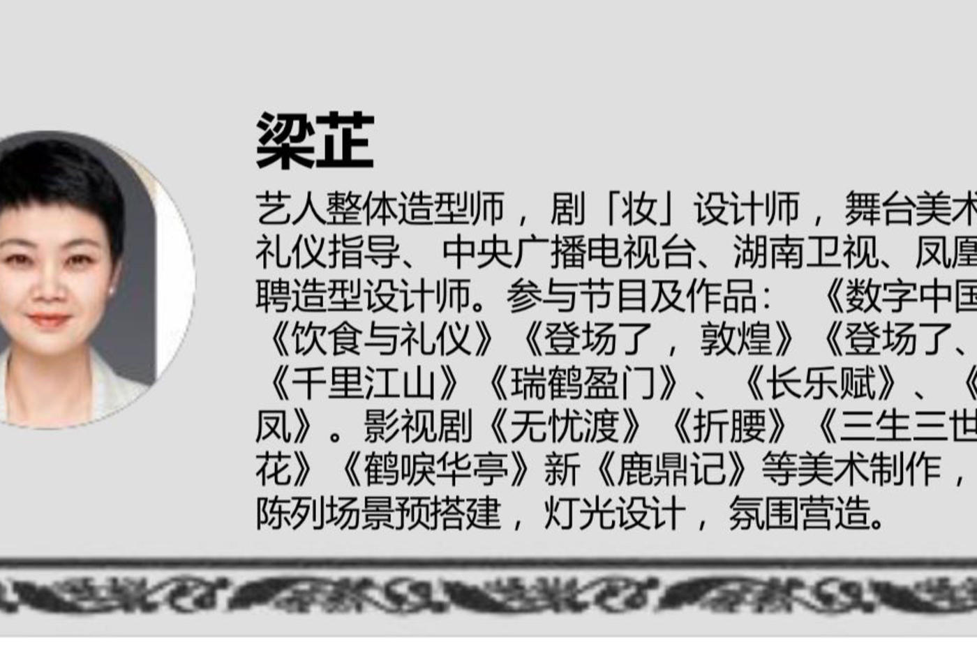 長樂未央,長毋相忘 華夏传統文化傅承者 ChangLeWeiYan创始人: 纪录片【婚礼中的非遗】制片人 梁芷女士 国家级平台编导 艺人整体造型师 剧「妆」设计师 私人高定策划师 舞台美术设计师 蒋金锐教授服装设计师课程讲师 拥有多年的编导设计经验,擅长舞台编导和视觉设计。对于创意表达和舞台视觉有独特的洞察力,能够为各种类型的节目和活动设计出令人耳目一新的视觉效果。 受到行业口碑家和客户的一致好评 参与了多个知名品牌的广告活动的视觉设计工作新创意广告活动的执行和呈现 熟练掌握舞台视觉编导和设计技能,擅长运用灯光、音效、舞美等元素进行创意表达 对于不同类型活动的规划和设计有独到的见解和创意 合作艺人: 王楚然汪涵张馨予井柏然王一博等 受邀参与 《数字中国纪录片》《央视霓裳时光秀》《在洛阳》 《登场了,敦煌》、《登场了、洛阳》《一馔千年》“馔家族”成员任鲁豫、欧阳应霁、马凡舒与合伙人倪萍、刘涛将继续吴江之行在多方查阅典籍和寻找食材中探寻古人的生活之味等综艺文化节目 设计呈现《千里江山》、《瑞鹤盈门》、 《长乐赋》、《百鸟朝凤》《乾坤》《一肩盛唐》 《百花词》《芍药叙》.... 等多个爆款传统案例作品,敢于突破创新,不失传统本色风采 [更多…]